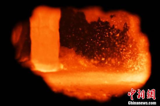 金川集團(tuán)鎳冶煉廠閃速爐車間主廠房?jī)?nèi),工作人員在閃速爐爐前燒口進(jìn)行低鎳锍排放作業(yè)。