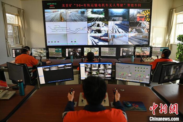 圖為金川集團(tuán)龍首礦“5G+有軌運(yùn)輸電機(jī)車(chē)無(wú)人駕駛”智能車(chē)間內(nèi),操作員正在進(jìn)行遠(yuǎn)程控制。