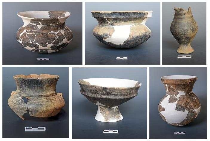 古城村遺址面積約4.2萬平方米,現(xiàn)存的貝丘堆積最厚處達(dá)6.5米,由大量尾部被敲破的螺螄殼與灰土層交替堆疊形成。碳十四測(cè)定年代為距今3600至2500年,約相當(dāng)于中原地區(qū)的商代至兩周時(shí)期。商代遺存可分為早晚兩段,早段發(fā)現(xiàn)保存完整的橢圓形環(huán)壕聚落,由中心臺(tái)地、外圍環(huán)壕和護(hù)坡組成,中心臺(tái)地面積約27000平方米,環(huán)壕和護(hù)坡周長約600米,這種聚落格局一直延續(xù)至兩周時(shí)期。商代晚段發(fā)現(xiàn)一批土坑墓和甕棺葬。兩周時(shí)期的遺存以房址、螺殼堆、灰燼、活動(dòng)面等居住類遺跡為主,房址多為方形半地穴式。出土青銅器、陶器、玉器、石器、骨器、木器等文物4000余件。