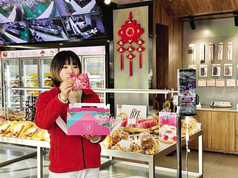 “第一次走進直播間的粉絲一定要入手玫瑰禮餅,它是采用蘭州苦水玫瑰制作的……”每天上午,位于九州中路的愛禮烘焙生活工廠店內一角,工作人員都在直播售貨。剛走進店里就能聞到撲鼻而來的糕點香味,琳瑯滿目的商品讓人應接不暇。