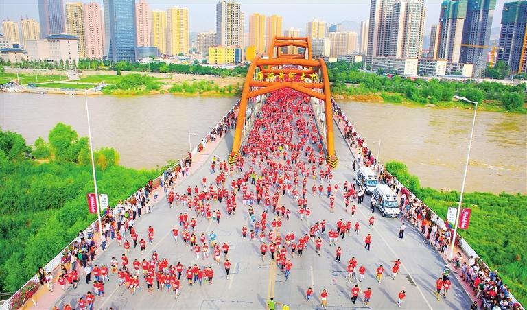 蘭州國際馬拉松選手經(jīng)過蘭州雁灘黃河大橋。