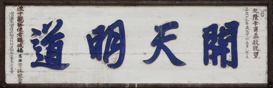 該匾懸于天水伏羲廟大門前牌坊正中。長(zhǎng)3.5米,寬1.25米,厚0.12米。素邊,匾心白底藍(lán)字,上下款朱書(shū)。此匾有雙上款和雙下款。第一個(gè)上款為“乾隆辛酉孟秋既望”,下款為“湟中觀察使者遼海楊應(yīng)琚薰沐敬書(shū)”;第二個(gè)上款為“嘉慶十二年歲次丁卯五月吉旦”,下款為“中憲大夫?qū)幭母蜓a(bǔ)知秦州事王公重建”。