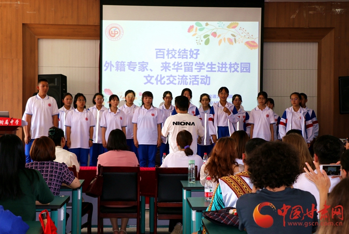 中國(guó)甘肅網(wǎng)6月26日訊 (西北角·中國(guó)甘肅網(wǎng)記者 張?zhí)m琴)6月25日下午,“百校結(jié)好”倡議之“外籍專家、來華留學(xué)生進(jìn)校園”文化交流活動(dòng)在蘭州交通大學(xué)附屬中學(xué)舉行。來自蘭州交通大學(xué)國(guó)際交流學(xué)院的外籍教師、來華留學(xué)生與該校師生熱情的互動(dòng)交流,為今年“百校結(jié)好”倡議系列活動(dòng)締結(jié)友誼之花再結(jié)“碩果”。