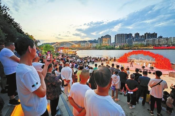 19日,游客在黃河岸邊欣賞黃河之濱百日千場音樂展演活動。新華社照片