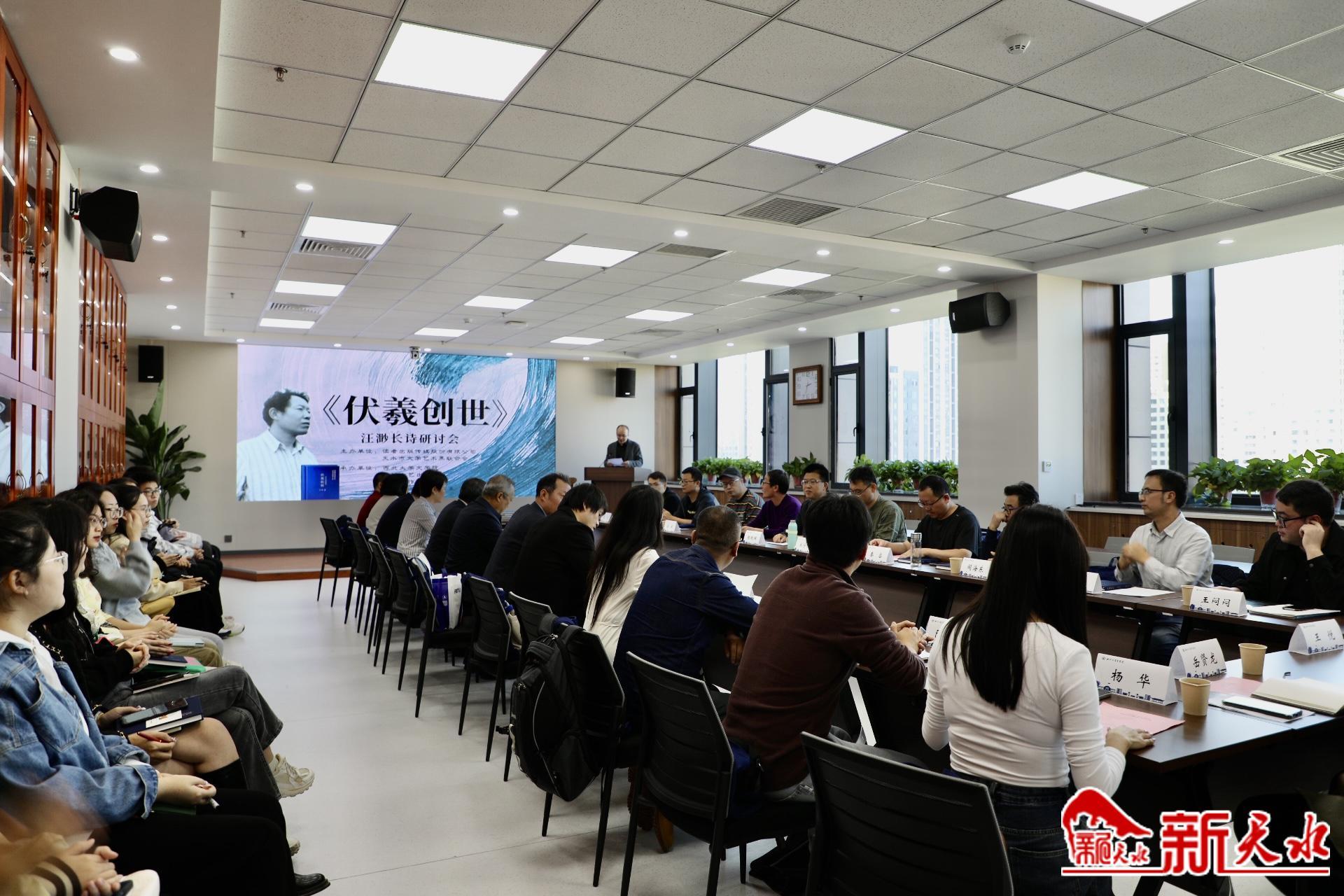 西北大學(xué)文學(xué)院副院長(zhǎng)陳然興主持研討會(huì)。西北大學(xué)文學(xué)院副院長(zhǎng)陳曉輝致辭。天水市文聯(lián)黨組書(shū)記、主席楊清汀,敦煌文藝出版社社長(zhǎng)楊繼軍,詩(shī)人、評(píng)論家宋寧剛,導(dǎo)演、作家、詩(shī)人陳非等來(lái)自甘肅及陜西兩地的作家、評(píng)論家、導(dǎo)演、編輯共約30人,就汪渺作品《伏羲創(chuàng)世》展開(kāi)深入交流,在史詩(shī)的界定、文本閱讀感受以及作品的再創(chuàng)造等層面進(jìn)行探討。