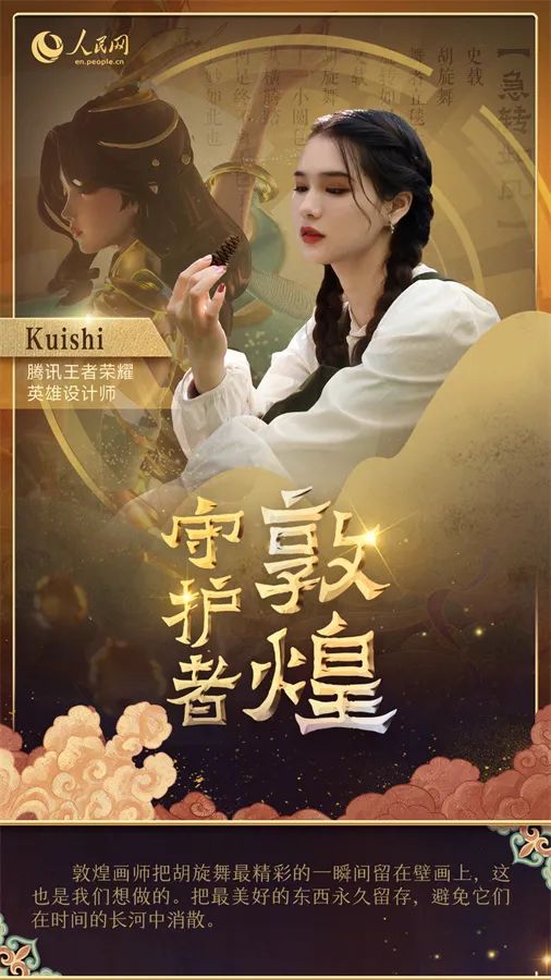 在敦煌千里之外的地方,騰訊的設(shè)計(jì)師們正在研發(fā)新的敦煌文化創(chuàng)新產(chǎn)品。熱門(mén)游戲《王者榮耀》的角色美術(shù)師Kuishi以莫高窟第220窟的壁畫(huà)為原型,為游戲角色設(shè)計(jì)了全新皮膚,將盛行于唐代的胡旋舞融入現(xiàn)代元素。