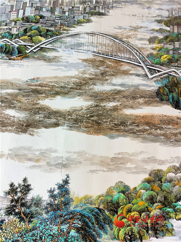 李建春,黃河上的橋梁也是他構(gòu)思畫面的重要部分,從小西湖出發(fā),有小西湖黃河大橋,中山橋,元通大橋,城關黃河大橋,金雁黃河大橋等各有特色的橋梁,但是畫的多了畫面被割裂,畫的少了有顯示不出來黃河的人文景觀,最后他畫了中山橋和金雁黃河大橋,就像畫框一樣圈住了城市的風景。
