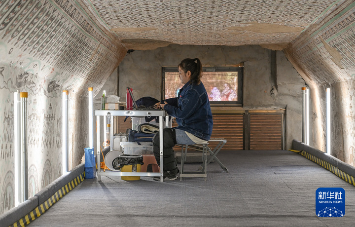 8月3日,在敦煌莫高窟正在保護(hù)修繕的第55窟內(nèi),一位文保工作者對(duì)采集的數(shù)據(jù)進(jìn)行整理。新華每日電訊記者 李賀 攝