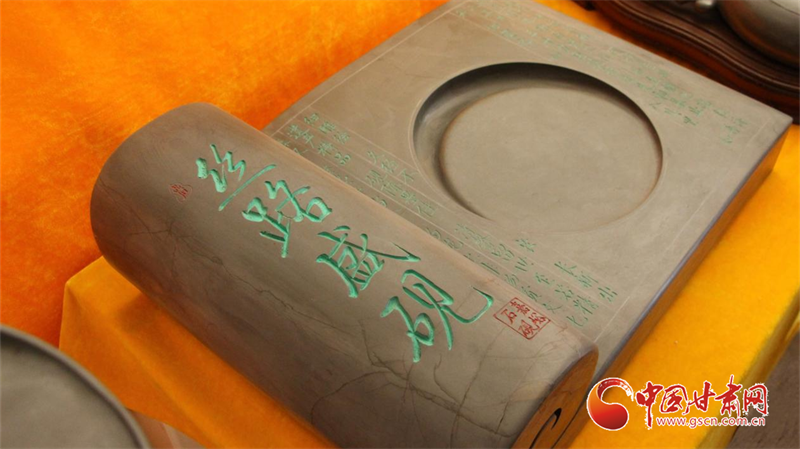 嘉峪石硯,取材于嘉峪山后的黑山峽深處,故又稱“黑山石硯”,是目前所知最早的古石硯之一。這種石硯質(zhì)堅(jiān)而細(xì)、扣之有聲,發(fā)墨快而不損毫,儲(chǔ)墨久而不干,“有史記載的三百多種石硯中,只有嘉峪石硯是帶有銘文出土的。這對于石硯的研究具有重要的史料價(jià)值。”劉宗學(xué)向?qū)嵺`團(tuán)成員系統(tǒng)地講述了嘉峪石硯的傳承歷史,并展示了自己以絲綢之路為主題創(chuàng)作的“絲路盛硯”組合石硯。這套石硯主要以甘肅十四個(gè)地州市的建筑、景觀、歷史人物為內(nèi)容,體現(xiàn)了甘肅省的根脈文化、黃河文化、長城文化、絲路文化、紅色文化等五大文化,表現(xiàn)出甘肅在絲綢之路經(jīng)濟(jì)發(fā)展與文化交流中的重要作用。