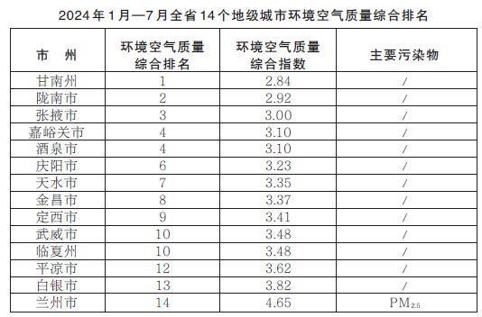2024年1月—7月,全省14個地級城市環(huán)境空氣質量綜合排名由高到低分別為:甘南州、隴南市、張掖市、嘉峪關市、酒泉市、慶陽市、天水市、金昌市、定西市、武威市、臨夏州、平?jīng)鍪?、白銀市、蘭州市。
