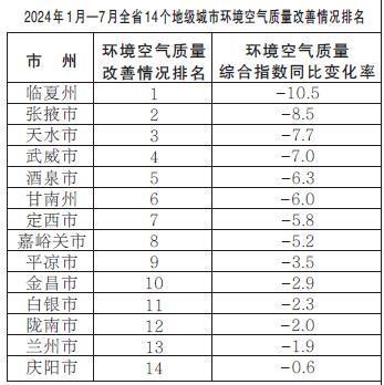 2024年1月—7月,全省14個地級城市環(huán)境空氣質量改善情況排名由好到差分別為:臨夏州、張掖市、天水市、武威市、酒泉市、甘南州、定西市、嘉峪關市、平?jīng)鍪?、金昌市、白銀市、隴南市、蘭州市、慶陽市。