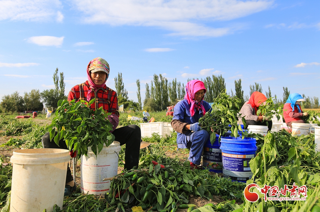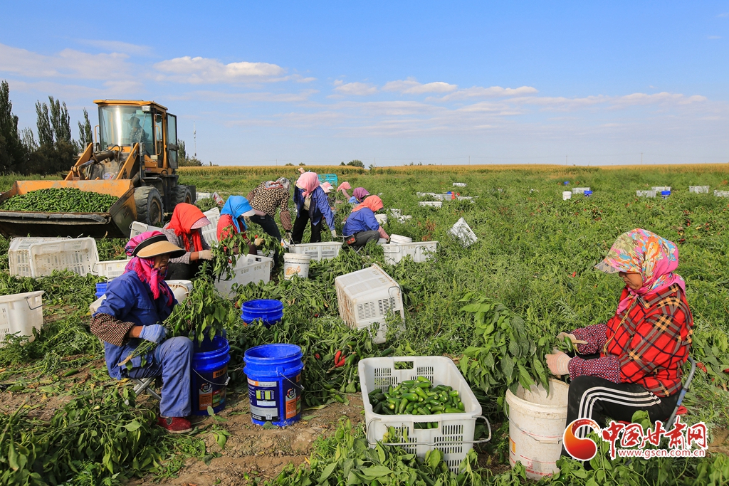 9月1日,嘉峪關(guān)市新城鎮(zhèn)長城村一農(nóng)民專業(yè)合作社種植的子彈頭辣椒喜獲豐收,種植戶搶抓農(nóng)時采摘,農(nóng)用機(jī)械車輛穿梭于田間地頭,鄉(xiāng)村田野呈現(xiàn)出一派繁忙的景象。
