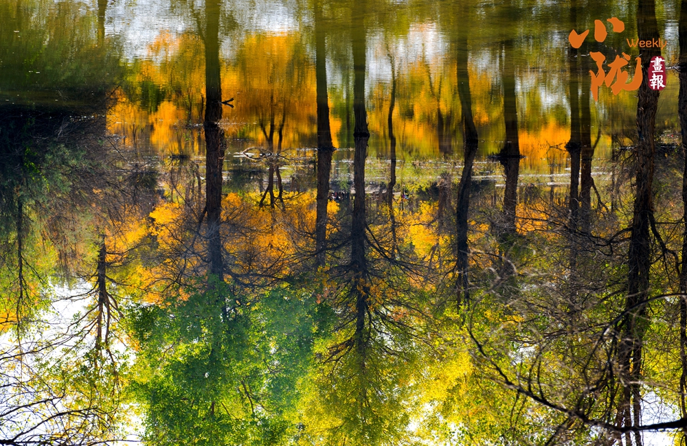 湛藍(lán)的天空、清澈的湖水、倒影的胡楊、金色的落葉,斑斕得如同油畫色彩。