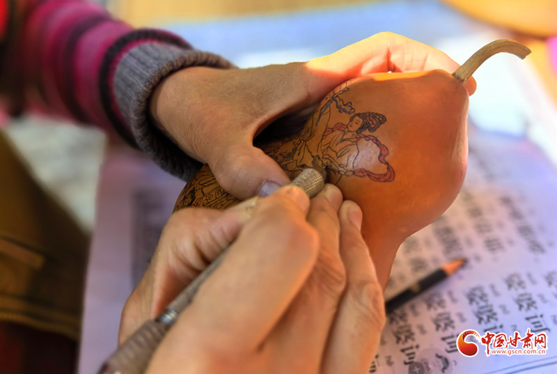 她還走進(jìn)蘭州開放大學(xué),為熱愛刻葫蘆的老年人手把手地傳授技藝,耐心細(xì)致地指導(dǎo)他們?nèi)绾卧谛⌒〉暮J上刻畫出精美的圖案。