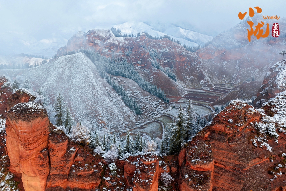 如斧劈刀削的赤壁,被冬雪溫柔地描摹,無垠的丹霞赤紅與素潔的白雪同框,赭紅似血、潔白如絮,在大地上展開一幅對比強(qiáng)烈又和諧共存的絢麗畫卷。