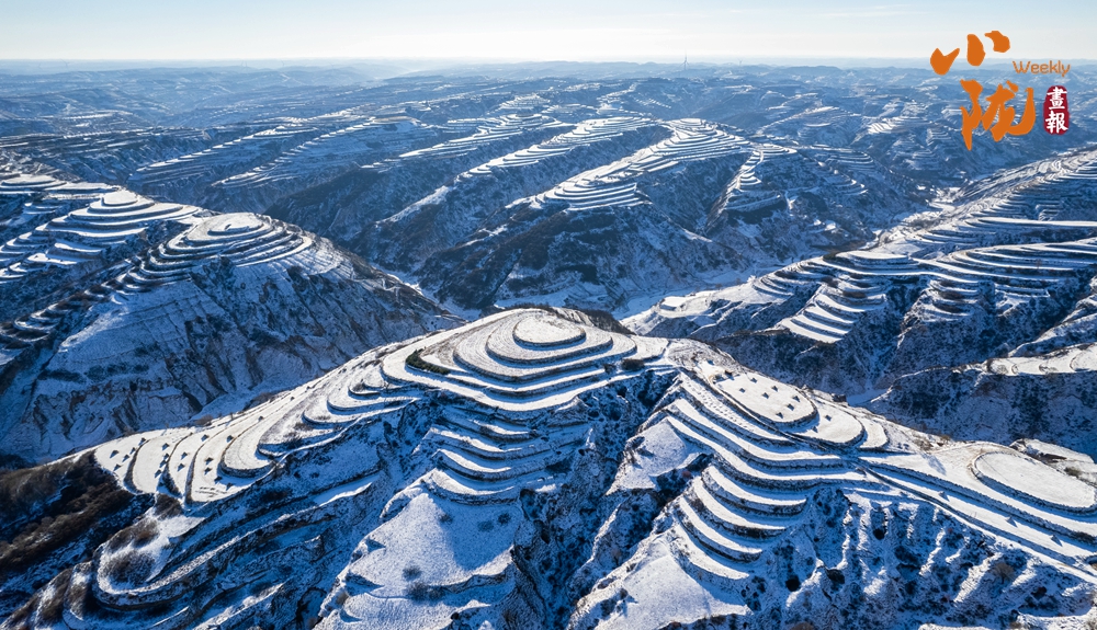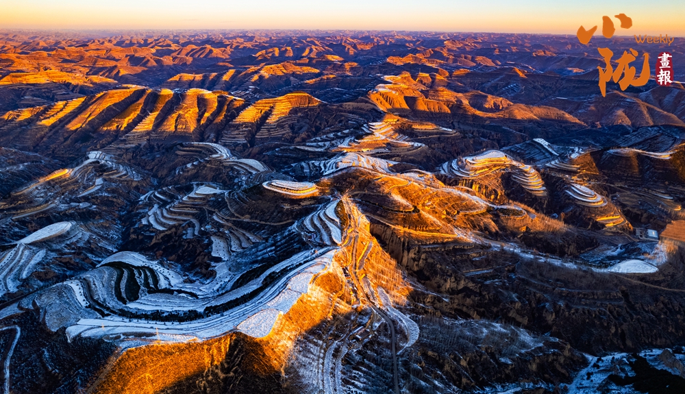 俯瞰雪后華池,溝壑縱橫的黃土高原披上銀裝,陽(yáng)光斜照雪野之上,投下深淺交錯(cuò)的光影,靜謐中流轉(zhuǎn)著溫柔的明暗,純凈而遼遠(yuǎn)。
