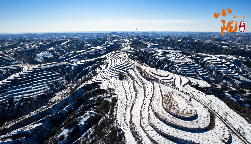 梯田坎沿的積雪輕柔如絮,堆疊出圓潤(rùn)起伏的曲線,一層疊一層,一卷連一卷,仿佛凝固的浪濤,靜默書(shū)寫(xiě)著這片紅色土地抗?fàn)幉幌?、?jiān)韌生長(zhǎng)的歷史記憶。