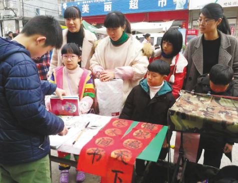 疫情之前,王子悅(左一)在集市上寫對聯(lián)送給借書的小朋友。