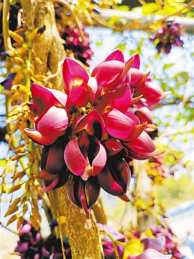 我終于登上山巔,來(lái)到那個(gè)罕見(jiàn)的常春油麻藤家族旁邊,眼前的景象,比我想象的更震撼。傷痕累累的蒼勁老藤猶如飛龍騰空而起,盤(pán)旋而上。只是,眼前的飛龍,是一條掛滿鮮花的飛龍。成千上萬(wàn)的花朵,密密麻麻包裹著幾根老藤,每一朵,都像是紫色的飛鳥(niǎo)。這些花不是同時(shí)開(kāi)放的:最早的已經(jīng)掉在地上,就像一群小鳥(niǎo)落地休息;更晚的還沒(méi)有吐出花蕊,像是巢中幼鳥(niǎo),還在閉眼做夢(mèng);數(shù)量最多的,正迎風(fēng)怒放,雖然是陰天,但透進(jìn)樹(shù)林的弱光,讓它們格外明亮。