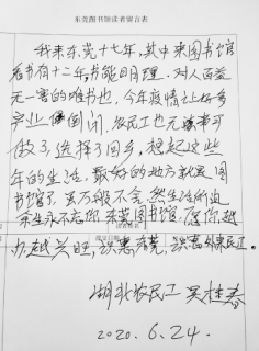 吳桂春:這句標(biāo)語我現(xiàn)在聽你說,才知道是誰的題詞,怪不得圖書館里的顯著位置都有“知識(shí)惠東莞”這句話。當(dāng)時(shí)覺得只要在圖書館辦一張借閱證,我這種外來民工也能進(jìn)來看書。書籍對(duì)每一個(gè)人來說都是公平的,不管誰看,都能得到實(shí)惠,知識(shí)也能惠及外來民工。