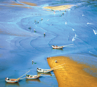 功夫不負(fù)有心人。經(jīng)過(guò)漫山遍野地毯式的尋覓,鄭德雄一行把霞浦海灘的拍攝點(diǎn)摸了個(gè)遍,也拍出了一幅幅漂亮的好作品。那照片上的霞浦真是美?。核{(lán)色的海水,金色的沙灘,種海帶的竹竿依序林立,滿載的漁船停泊在靜靜的港灣,趕海人背著沉甸甸的魚(yú)簍,正走在金色的沙灘上……