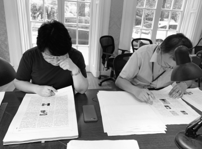 上海辭書(shū)出版社社長(zhǎng)秦志華(右)和副總編輯張敏審讀《辭?!罚ǖ谄甙妫┬?。