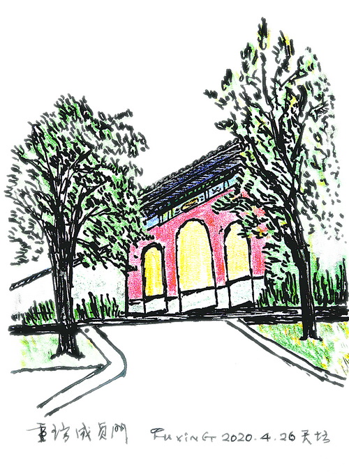 書已寫罷,小寒節(jié)氣過(guò)后,我又多次去天壇,不為寫作,只是習(xí)慣,仿佛腳步慣性,去天壇轉(zhuǎn)轉(zhuǎn),就會(huì)感覺充實(shí)一些。2020年1月20日正值大寒節(jié)氣,那天下午,我從圜丘到成貞門西北側(cè),那里并排有兩把座椅,我坐在座椅上畫成貞門。春節(jié)將近,除了工人在懸掛紅燈籠、安裝慶祝春節(jié)的展牌,天壇里的游人并不多。我和很多游人一樣,不知道,或者說(shuō)不敏感,一場(chǎng)疫情正如餓虎撲食那樣向我們迫近。