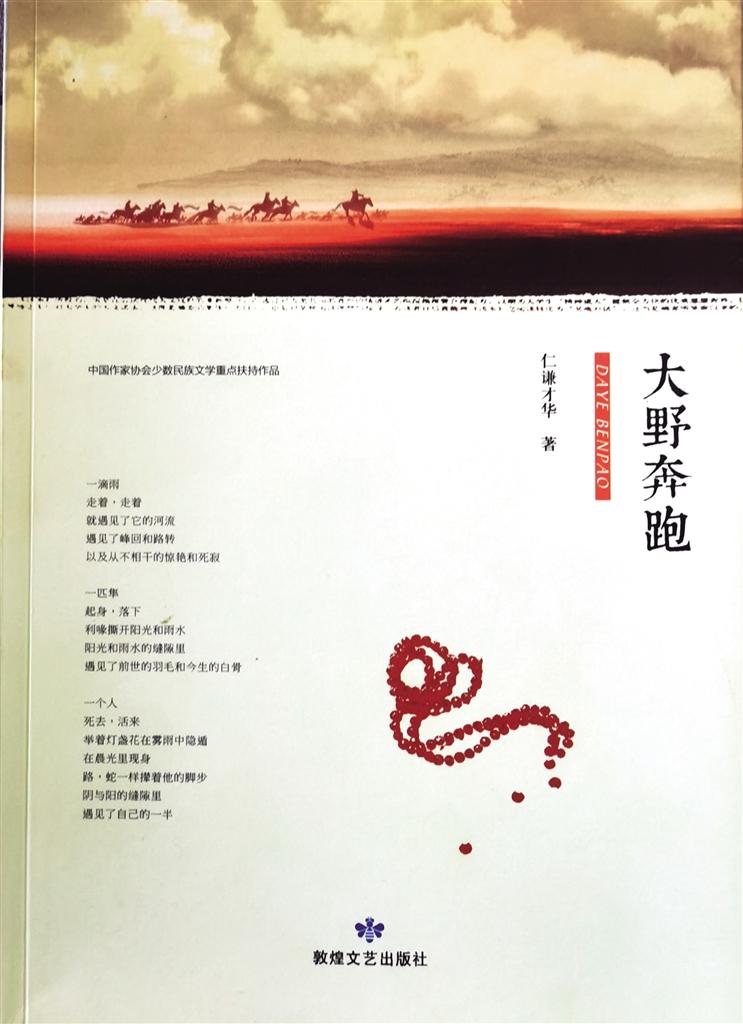 詩歌集《大野奔跑》是仁謙才華近年來的傾心之作,該作品由敦煌文藝出版社出版發(fā)行。詩集由作家張存學作序,收錄了仁謙才華4年來發(fā)表在《詩刊》等刊物上130余首詩歌。張存學在序中這樣評價:“語言,既是阻礙,也是抵達之路,這個緊張度也是考驗一個寫作者的坎,這個坎過得好一些就能夠把握住詩抵達生命的本真,把握不好,就會在空泛的意象中游走。仁謙才華在這方面的蛻變,從他這本詩集能夠看出,他由早期的直抒胸意、向外張揚變得安靜起來,變得從容而多思,也變得獨立而內在……”