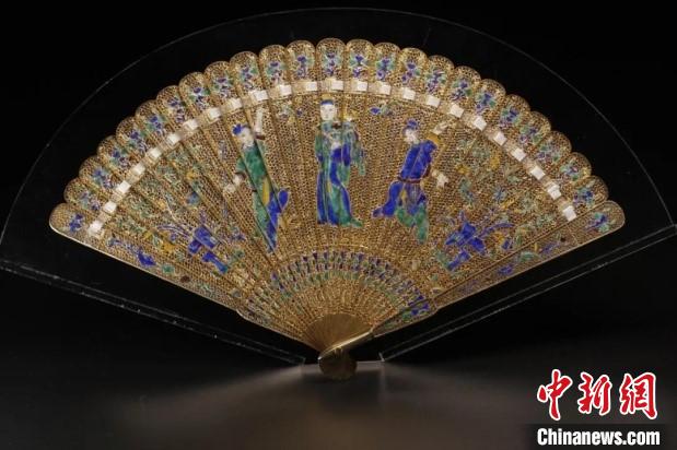 館藏的銀累絲鎏金燒藍戲曲人物故事圖折扇。廣東省博物館 供圖