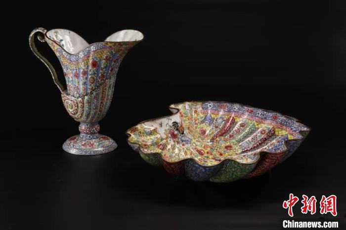 館藏的銅胎畫琺瑯花卉紋洗盤及水澆。廣東省博物館 供圖