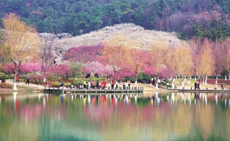 進入景區(qū),走過一座石拱橋,眼前,一汪清水,綠意萌發(fā),乃傳說的“鹿女湖”。不時用手撩撥著拂面的楊柳,沿湖畔小徑繞行數(shù)百米,往上攀登,穿過一個山口,整個梅嶺景區(qū),便不驚不乍,呈現(xiàn)在眼前。霎時,我們被如此壯觀的山水梅林驚呆了。清凌凌的湖水邊、亭臺水榭間,依山而栽種的梅樹,紅的、白的、粉的、綠的梅花,競相綻放,層層疊疊、婆娑飛舞,爭芳斗艷、姹紫嫣紅,儼然一幅3D山水畫,仿佛置身“香國仙境”。