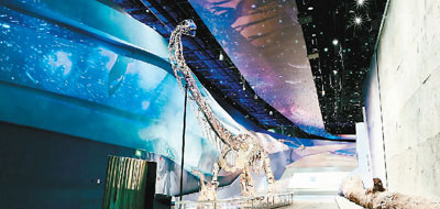 進入展廳,人們首先會被來自侏羅紀(jì)時代的龐然大物——中加馬門溪龍化石所震撼。馬門溪龍是中國發(fā)現(xiàn)的體型最大的蜥腳類恐龍之一,頸部特別長。這具化石出土于新疆奇臺縣,2016年修復(fù)裝架完成,高7.5米,長24米,脖子就有12米長。