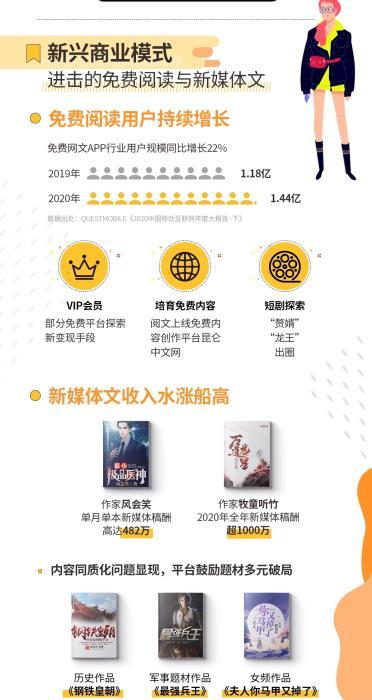 而在近年,免費閱讀和新媒體文成為新興商業(yè)模式,得到快速發(fā)展。其中,免費閱讀和新媒體文激活了下沉市場,成為刺激數(shù)字閱讀市場快速發(fā)展的新興力量,為網(wǎng)絡文學的內(nèi)容和用戶帶來新增量,也拓寬了網(wǎng)絡文學市場規(guī)模。