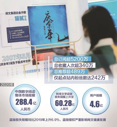 有數(shù)據(jù)顯示,2020年中國網(wǎng)絡文學市場規(guī)模為288.4億元,網(wǎng)絡文學通過IP全版權運營間接或直接影響了動漫、音樂、影視、游戲等合計約2531億元的市場,對數(shù)字文化產業(yè)的影響范圍超過40%。但令人痛心的是,2020年中國網(wǎng)絡文學盜版損失規(guī)模達60.28億元,同比上升6.9%。