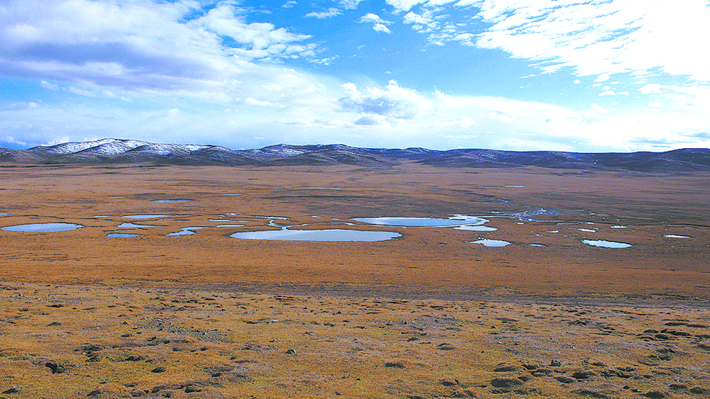 約古宗列位于青藏高原東北部,海拔高度在4200米~4800米,地勢西北高,東南低。站在腳下小泉邊,抬眼先看到的是西面距我們最近的雅合拉達合澤山,它是1952 年新中國第一個河源查勘隊曾認定的黃河源頭山。南望,遠處最高的雪峰,是長江黃河的分水嶺巴顏喀拉山;視線左移,東方藍天白云下,同樣白雪皚皚的是阿尼瑪卿山。以約古列宗為中心輻射,在這東西長約220 公里,南北最大寬150 公里的高山草甸帶與高山草原帶的過渡地帶,東面阿尼瑪卿山阻擋了東南暖濕氣團西進,南面巴顏喀拉山又削弱了溯谷地北進的西南季風(fēng)勢頭,再加之北面布爾漢布山的屏障作用,把源區(qū)與干旱的荒漠地區(qū)隔開,使這里年平均氣溫在-4℃左右。青藏高原半濕潤地區(qū)氣候和遠處雪山冰川的不斷融化,使母親河上源的兩眼泉和其他那些數(shù)不清的泉,源流不斷,經(jīng)年汩汩。