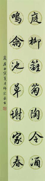 庭柳籬菊陶令酒,鳴禽池草謝家春。 釋文:庭前柳樹,籬邊菊花,陶淵明飲酒于此,怡然自得;池塘里長滿了春草,樹上的鳴鳥冬去春來,謝靈運(yùn)因此寫出了這樣的千載名句。韓宗岳(滿族)