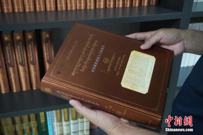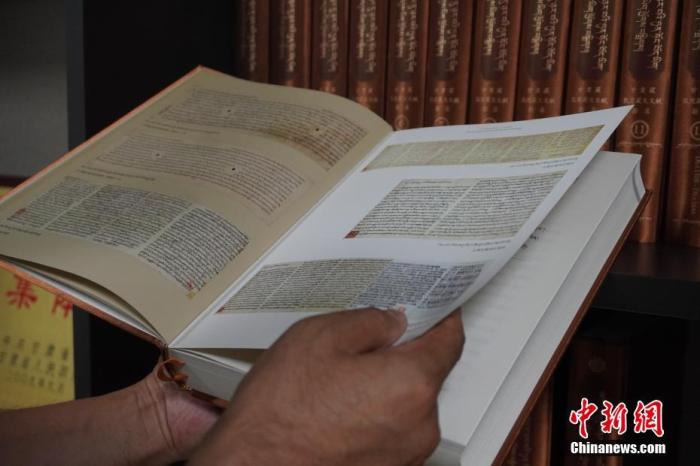 8月26日,甘肅蘭州,甘肅民族出版社資料室內收藏的《甘肅藏敦煌藏文文獻勘錄》。該叢書共30卷,約2205余萬字,收錄了6700余件甘肅藏敦煌藏文文獻,系國內外首次以全文錄入的方式出版。 中新社記者 九美旦增 攝