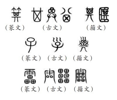 ?。ㄎ澹┧^“9353”,指的是《說文》所收全部正篆,即《說文》分析解釋的全部字?!墩f文》收字以篆文為“正”,作為標(biāo)準(zhǔn)字體,這就是許慎所說的“今敘篆文,合以古籀”的收字原則。“今敘篆文”,就是以篆文(小篆)作為標(biāo)準(zhǔn)正字,同時(shí)也會根據(jù)需要收列部分古文和籀文?!墩f文》所謂“古文”主要是孔子壁中書和民間所獻(xiàn)古文經(jīng)所用的文字,“籀文”即傳為西周晚期太史籀所編字書《史籀篇》上的文字。從《說文》來看,收入的古文、籀文,主要是與篆文有明顯差異的字形。如篆文“箕”“子”“雷”下所收列的古文、籀文: