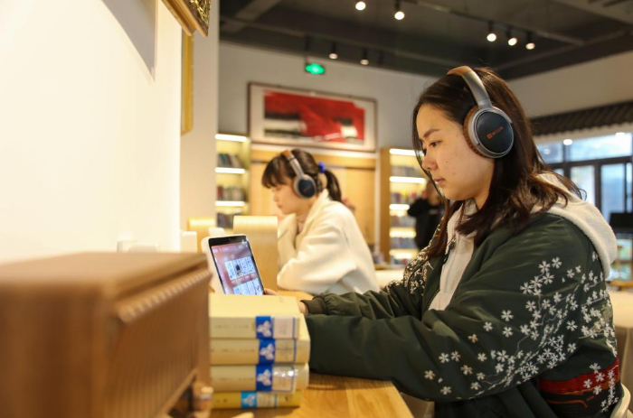 11月20日,市民在馬鞍山市采石磯悅書房“聽書”。