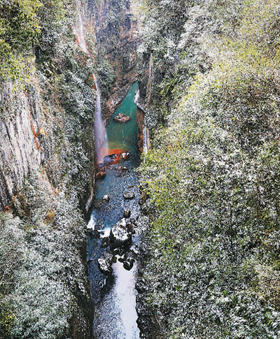 雪花飄飄,沿棧道往下走,山林被染成一幅黑白山水畫(huà)。風(fēng)雨橋在地縫之上凌空飛舞,仿佛是通往地心的鑰匙。約75米深的云龍絕壁垂直下切,狹長(zhǎng),呈U型,崖壁皺紋黑灰,宛若剛出鞘的寶劍閃著寒光。底下是云龍河,水淺,清澈,叮叮咚咚,增添些許歡快,而讓地縫變得富有激情的是沐撫盆地流出的7條瀑布,其中最美的是五彩黃龍瀑布。瀑布從60米高的峭壁跌落下來(lái),纖細(xì),飄灑,婀娜。“銀花下散布水臺(tái),混沌鑿破山根隈。”從暗河流出的水含黃鐵礦,把巖壁和卵石刷洗得斑斕,連河水也變得絢麗。