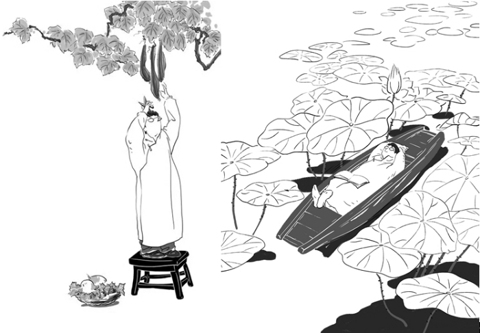 綠葉扶紅花,雅閣、秋雨為這本書的配圖也頗有特色。隨筆《理想與鄉(xiāng)愁》的封面,是一位戴著眼鏡、長相酷似作者的文人站在小凳子上,準(zhǔn)備將掛在枝頭的絲瓜摘下來以供午餐之需,腳旁一只狗狗看守著筐子里的兩個大水蘿卜。這幅圖與左面的書名遙相呼應(yīng):作者的“理想”與“鄉(xiāng)愁”就在絲瓜藤下結(jié)為了一體。詩集《人生歸處是田園》的封面是三株樹下,那位戴眼鏡的文人坐在長椅上,望著右面空椅子上的三只小鳥,一付若有所思的樣子;而葉廷芳為詩集所寫序言文末的尾花,還是這幅圖,只不過沿縱軸轉(zhuǎn)動180°——文人從右面望向左面。一里一外兩幅畫互為鏡像,似乎是暗示人們,藝術(shù)就是社會生活既真實又不完全一樣的反映。
