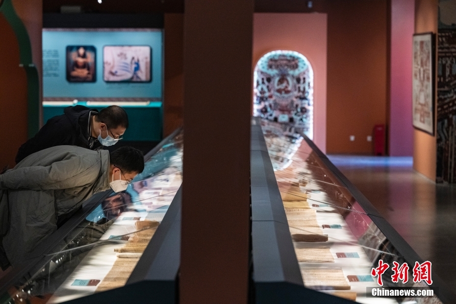 圖為“敦煌遺書”展區(qū)內(nèi)的經(jīng)文抄本展品吸引觀眾仔細查看。 中新社記者 侯宇 攝