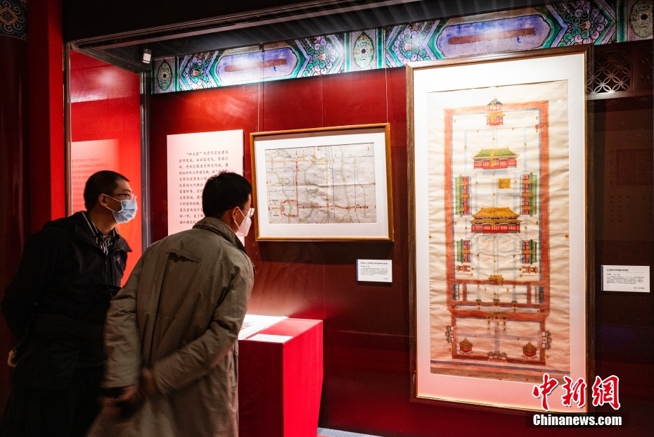 圖為“明清檔案”展區(qū)內(nèi)展示的“樣式雷”《大高殿內(nèi)坍塌修補圖樣》(右)等展品吸引觀眾查看。 中新社記者 侯宇 攝