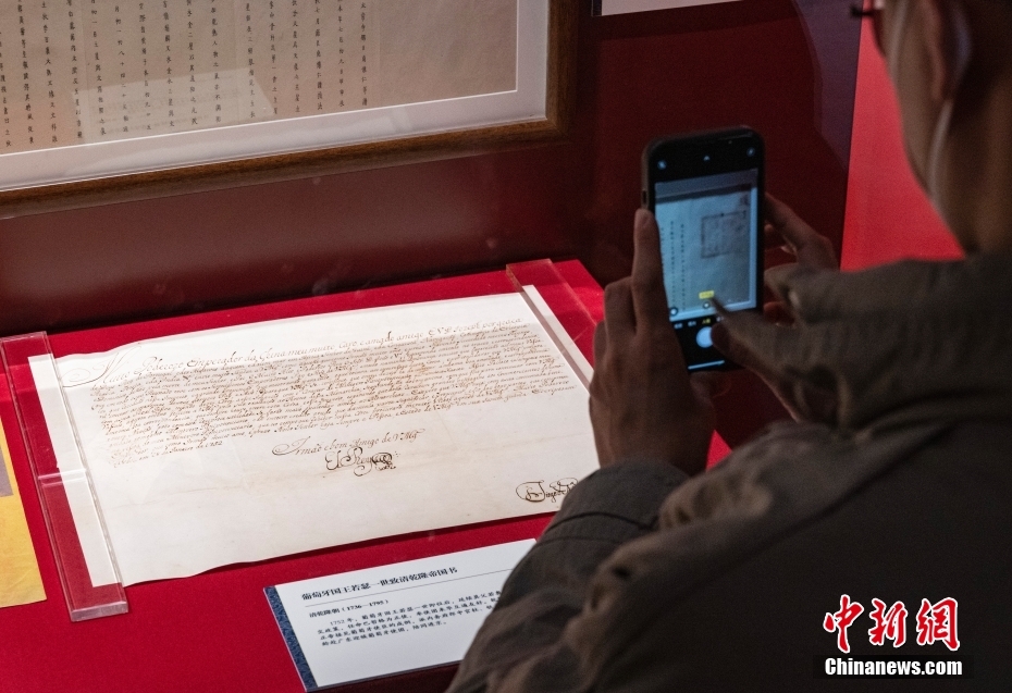 圖為“明清檔案”展區(qū)內(nèi)展示的“葡萄牙國王若瑟一世致清乾隆帝國書”展品吸引觀眾用手機記錄。 中新社記者 侯宇 攝