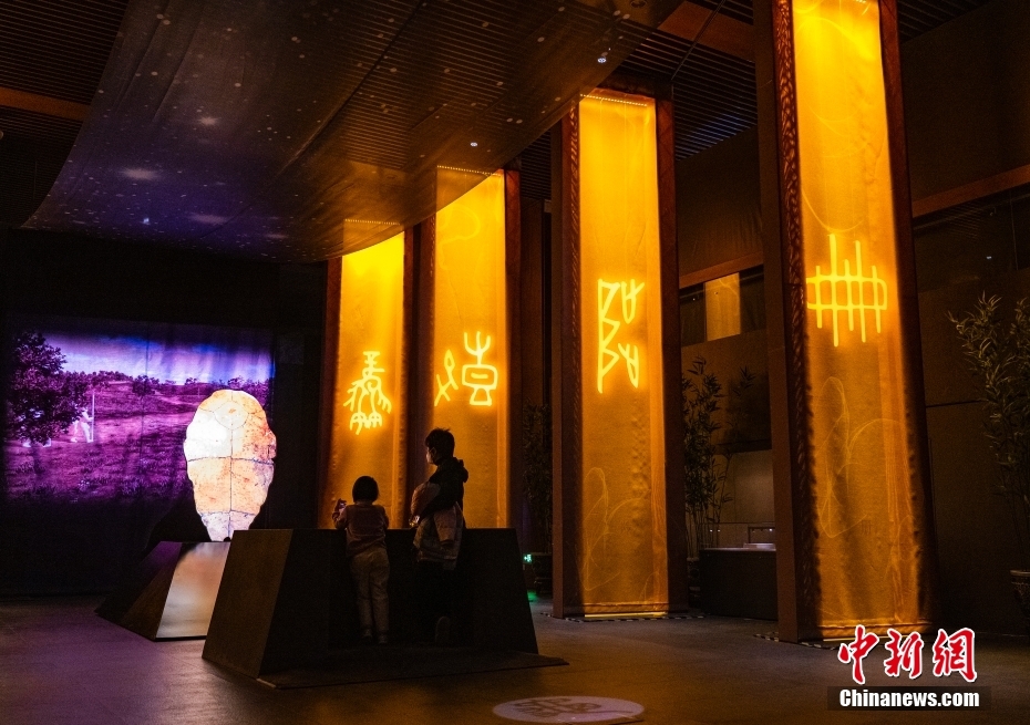 圖為“殷墟甲骨”展區(qū)內(nèi)的聲光互動區(qū)吸引觀眾體驗。 中新社記者 侯宇 攝