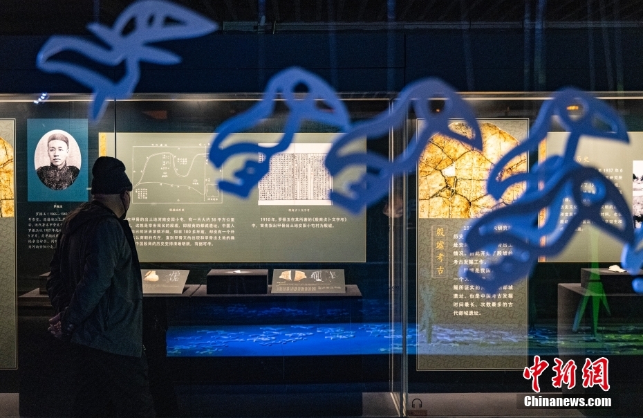 圖為“殷墟甲骨”展區(qū)內(nèi)一位觀眾參觀“甲骨文之父”王懿榮的介紹。 中新社記者 侯宇 攝