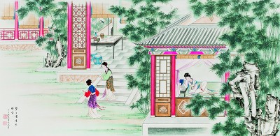 寶玉順腳一徑來到瀟湘館,信步走入,只見鳳尾森森,龍吟細(xì)細(xì),悄無人聲。走至窗前,一縷幽香從碧紗窗中暗暗透出。寶玉便將臉貼在紗窗上,往里看時(shí),耳內(nèi)忽聽得細(xì)細(xì)的長(zhǎng)嘆了一聲道:“每日家情思睡昏昏。”譚鳳嬛繪