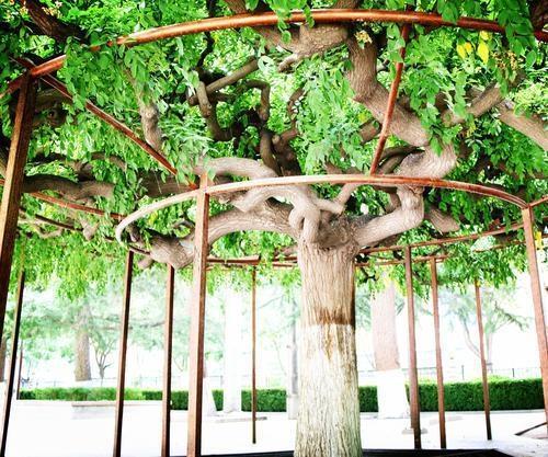 博物館里的這兩棵龍爪槐分別種植在展覽大樓前的東西兩角,是博物館的老專家郭維屏先生所種植。1959年秋冬,甘肅省博物館從通渭路舊館搬遷到七里河的新館,新館內(nèi)一片荒涼,亟待綠化。而就在此時,郭維屏老先生調(diào)入博物館工作,參與到館內(nèi)的綠植規(guī)劃建設(shè),也正好發(fā)揮自己的藝術(shù)特長。這兩棵龍爪槐的幼株是郭老先生從五泉山苗圃選購的,栽種到展覽大樓前院的東西兩角,槐樹的周圍還設(shè)計了幾個形狀不一的花壇,花壇內(nèi)種植了各色各樣的樹木,一眼望去郁郁蔥蔥,生機盎然,頗有些韻味。這兩棵龍爪槐剛栽種時體型嬌小,看起來很不起眼。經(jīng)過郭老先生和博物館幾代人的悉心栽培,如今已是樹冠優(yōu)美,花香四溢。每到槐花盛開的時候,滿庭飄香,沁人心扉,成了博物館里一道靚麗的景色,引得路人駐足欣賞。東角的龍爪槐高約2米,樹干粗達2尺多,樹冠如傘,頂端長出八、九個主枝向四面伸展,屈曲盤繞,而后又分為數(shù)十個中枝和數(shù)百個小枝,互相攀援,屈折如爪,一枝獨秀。而西角的龍爪槐因基建的原因長勢受到一定影響。