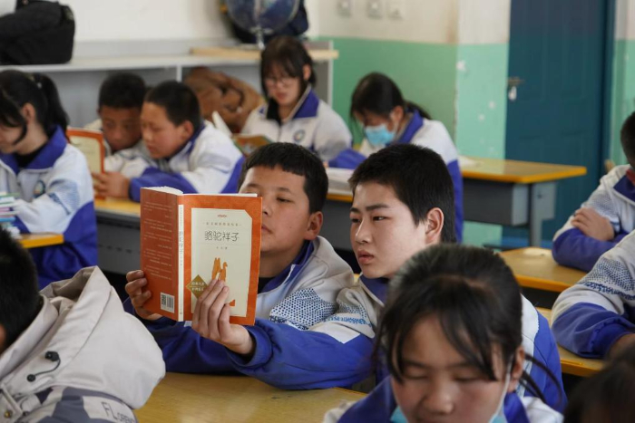 寧夏靈武市狼皮子梁學(xué)校的學(xué)生同讀一本書。受訪者供圖