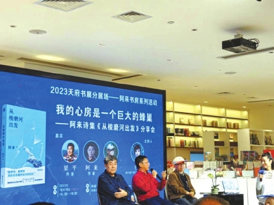 2023天府書(shū)展,各種名家分享會(huì)讓讀者應(yīng)接不暇。除了成都世紀(jì)城新會(huì)展中心主會(huì)場(chǎng),分會(huì)場(chǎng)的活動(dòng)也精彩紛呈。10月15日下午,在西部文化產(chǎn)業(yè)中心阿來(lái)書(shū)房,阿來(lái)、葉舟、梁平三位名家開(kāi)啟“我的心房是一個(gè)巨大的蜂巢——阿來(lái)詩(shī)集《從梭磨河出發(fā)》分享會(huì)”。三人上演老友記,分享會(huì)由阿來(lái)的青春期談起,氛圍詼諧幽默、愜意深情。